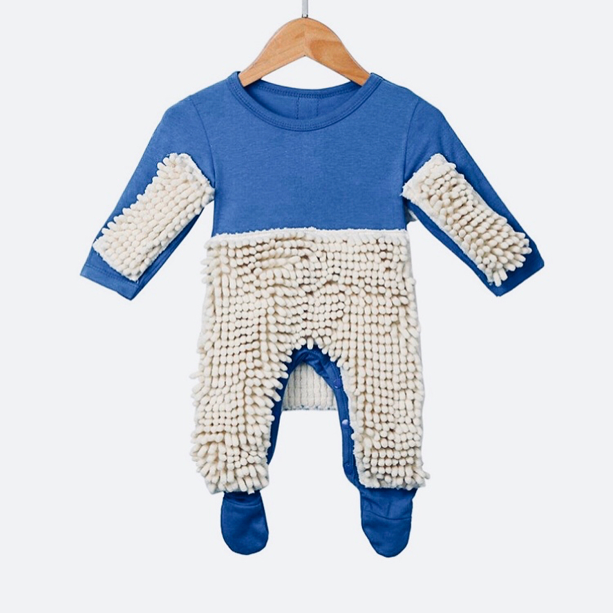 The romper, which comes in various colors from 3 months to 12 months, has contrasting pieces of mop fabric attached to strategic areas of the garment. For example, the elbows and knees are covered with mop tendrils that come into contact with the floor or carpet and pick up dust as the baby crawls along.