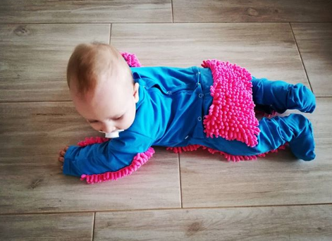 For example, the elbows and knees are covered with mop tendrils that come into contact with the floor or carpet and pick up dust as the baby crawls along.